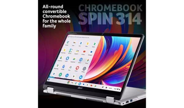 The Acer Chromebook Spin 314 is a stylish, convertible laptop powered by Google’s Chrome OS. Its 14-inch WUXGA display offers 10% more detail than a typical Full HD screen, providing a sharper and more vibrant viewing experience. The touchscreen, combined with the 360-degree hinge, lets you switch between four different modes—laptop, tablet, display, and tent—giving you flexibility for all your tasks. Powered by an Intel N100 CPU and 4GB of RAM, the Spin 314 handles your favorite apps with ease. Plus, with 128GB of storage, you have ample space for your apps and files.