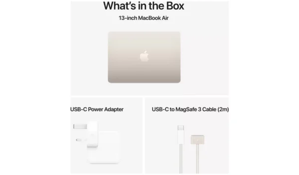 Box Contents: 13.6-inch MacBook Air, USB C Port Power Adapter, USB C to MagSafe 3 Cable (2m)