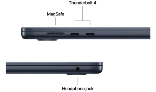 With two Thunderbolt 4 ports, MagSafe charging, a headphone jack, Wi-Fi 6E, and Bluetooth 5.3, MacBook Air lets you connect everything you need. It even supports up to two external displays.