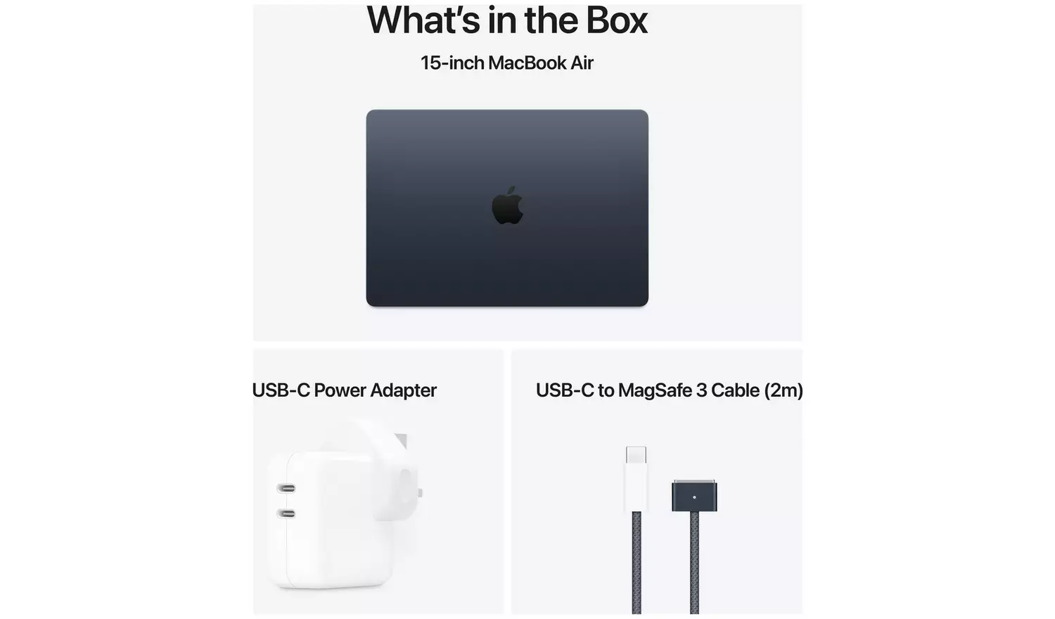 Box Contents: 13.6-inch MacBook Air, USB C Port Power Adapter, USB C to MagSafe 3 Cable (2m)