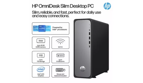 The HP OmniDesk Slim Desktop is the perfect solution for home productivity, making it easy to handle everything from organizing family photos to streaming your favorite shows and managing budgets. This sleek and dependable desktop comes equipped with the latest Intel processors, generous memory for faster data transfers, and easy-access ports for convenience. With Wi-Fi 6 and a keyboard featuring a dedicated Copilot key to quickly launch the AI Assistant, it’s built to keep up with your everyday tasks.