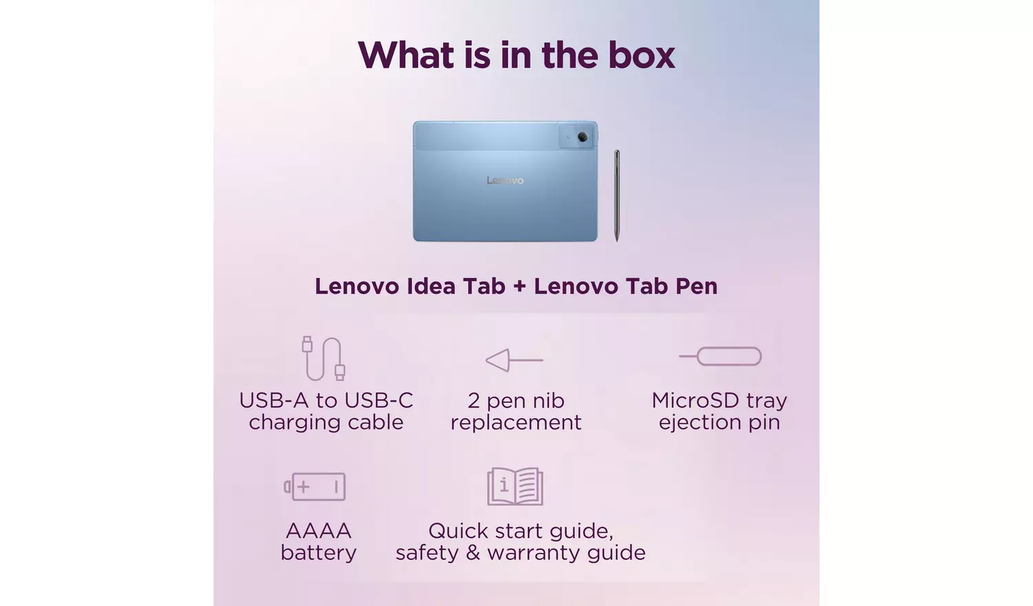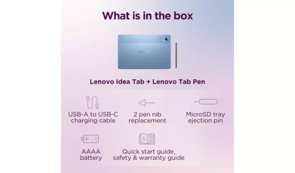 In the box: Tablet, Lenovo pen, USB-A to C charging cable, Quick start guide and other accessories