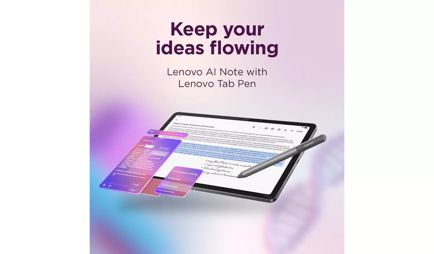 Make note-taking smarter with Lenovo AI Note in the Notepad app. Paired with the Lenovo Tab Pen, it’s easier than ever to jot down ideas. Let AI help you expand on your thoughts, tidy up your notes with AI Rewrite, and extract key points with AI Summary—keeping your study sessions organized and efficient.